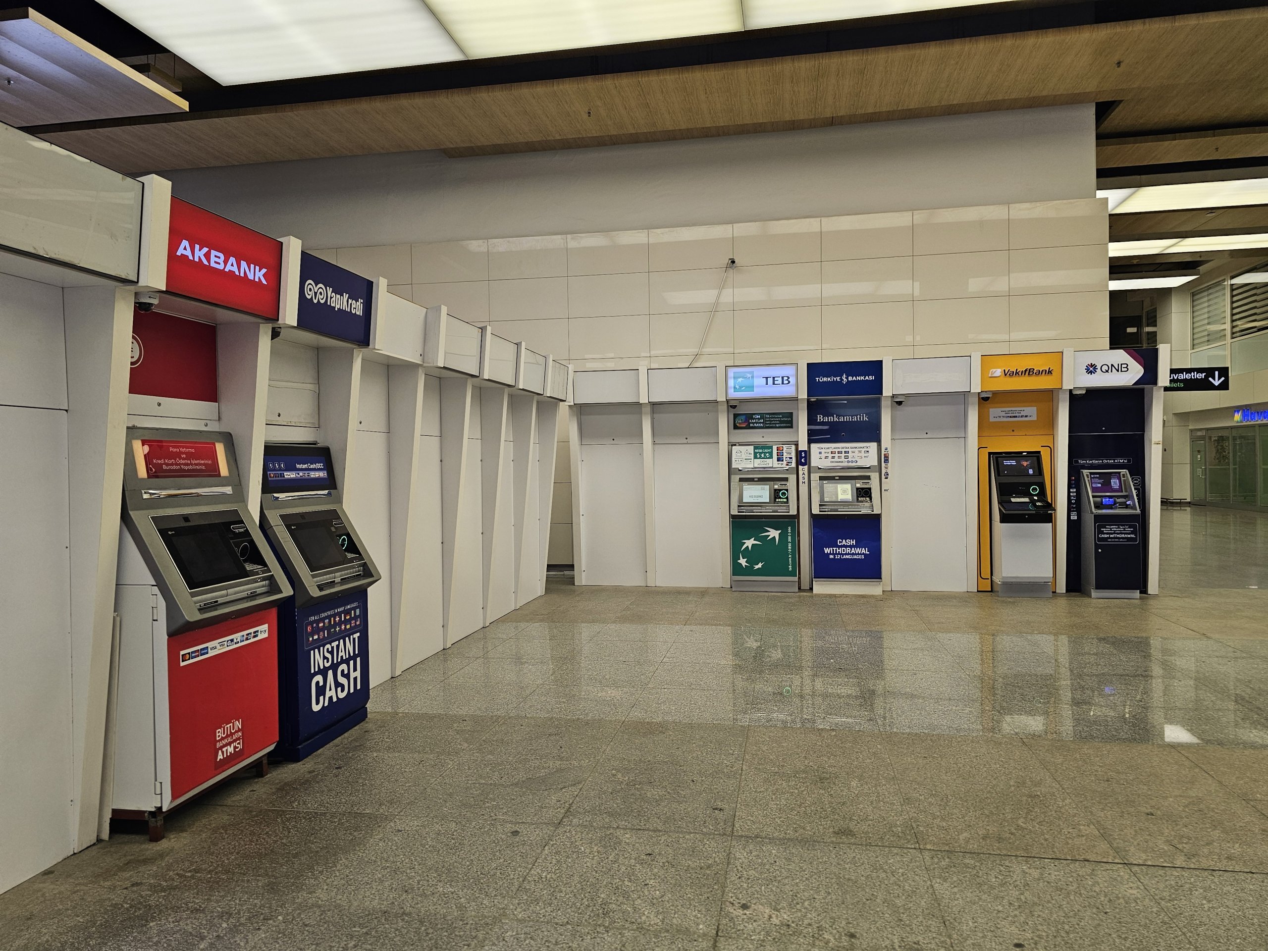 Банкомати звичайних турецьких банків розташовані в багатьох місцях в залах прильоту обох терміналів.
