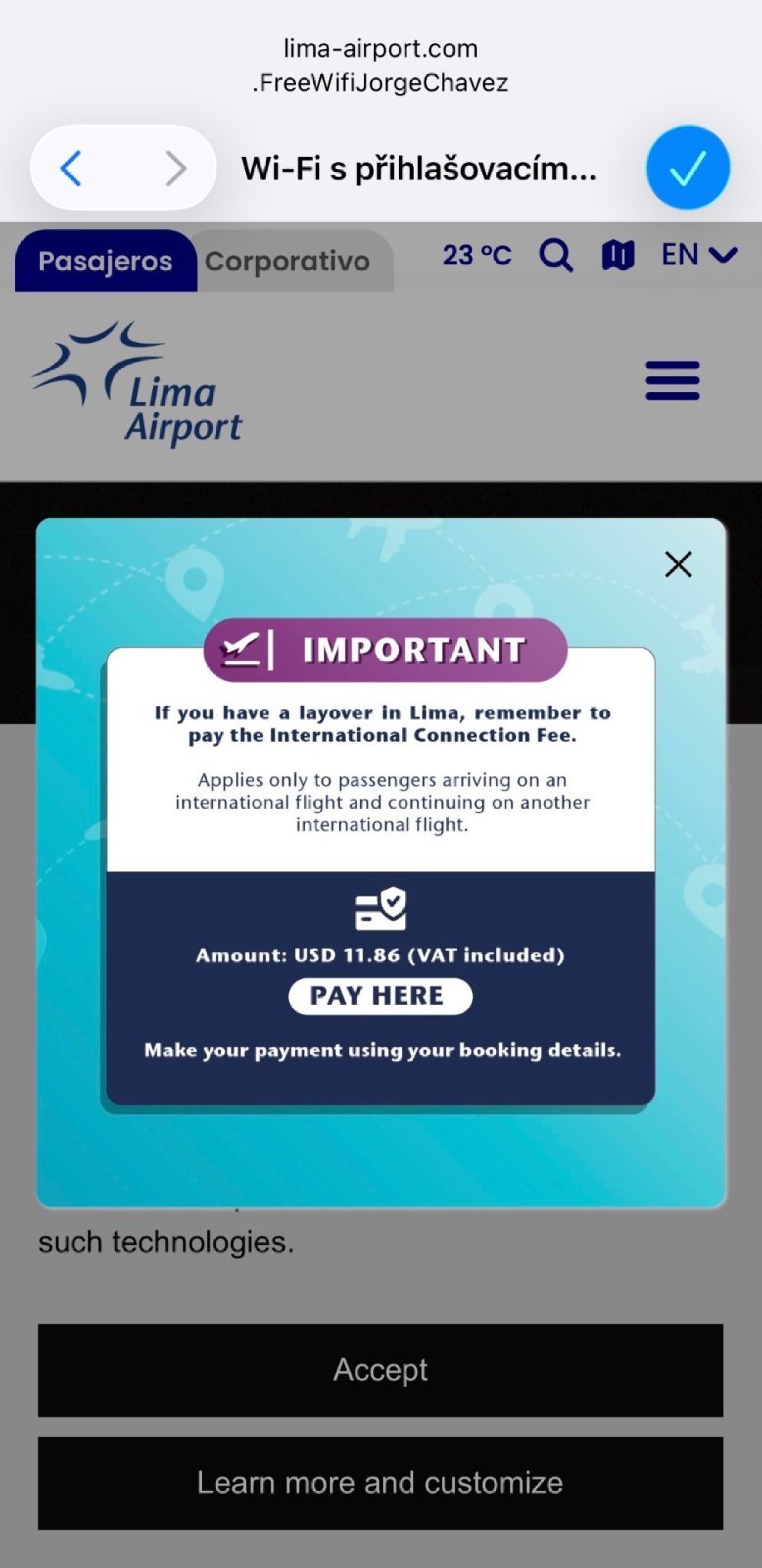 На жаль, аеропорт Ліми (LIM) стягує транзитний збір (TUUA) у розмірі 11,86 доларів США з стикувальних рейсів з 7.12.2025.