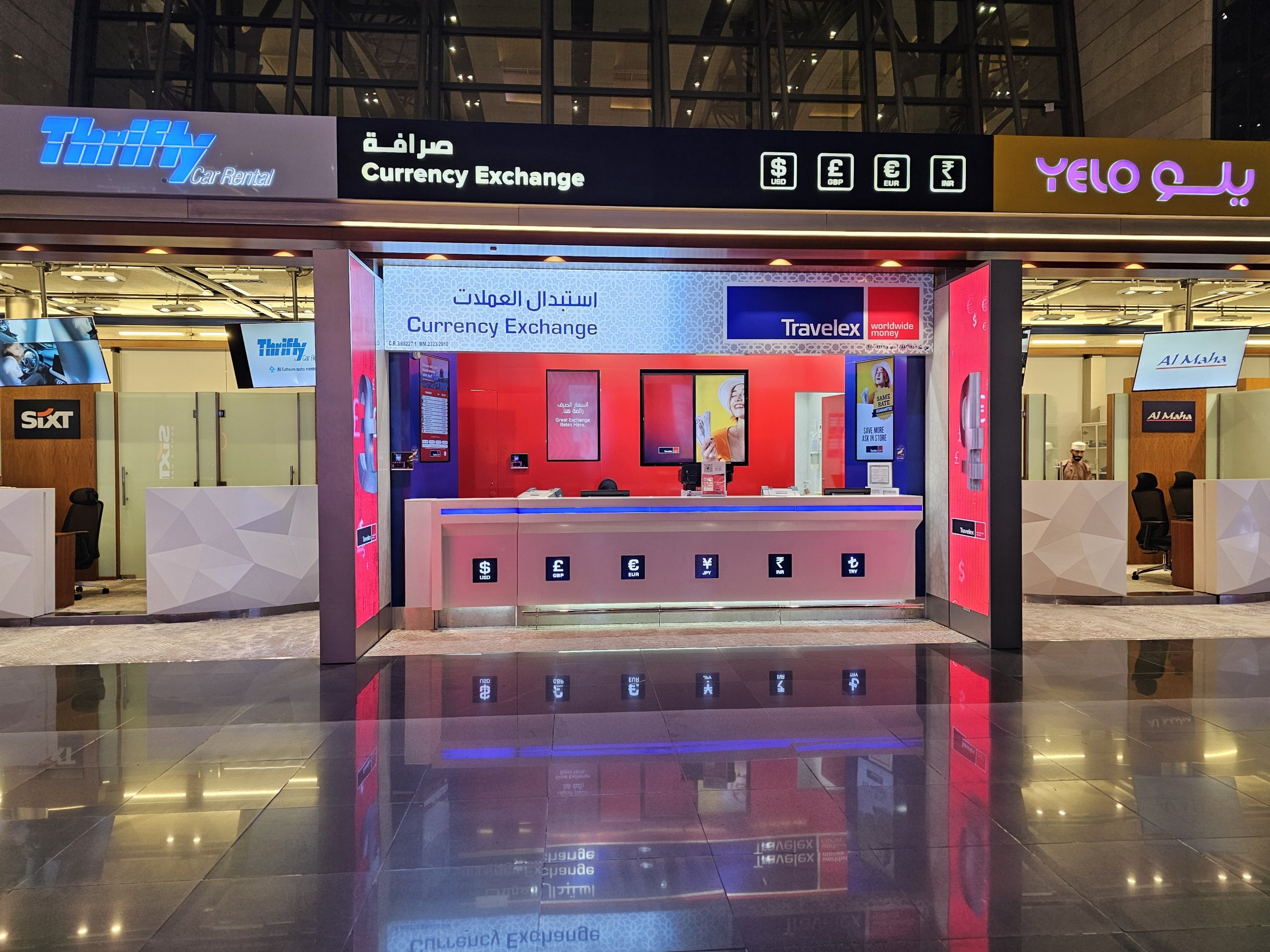 Обмінні пункти в аеропорту працюють під управлінням компаній Travelex та Global Money Exchange з невигідними курсами.