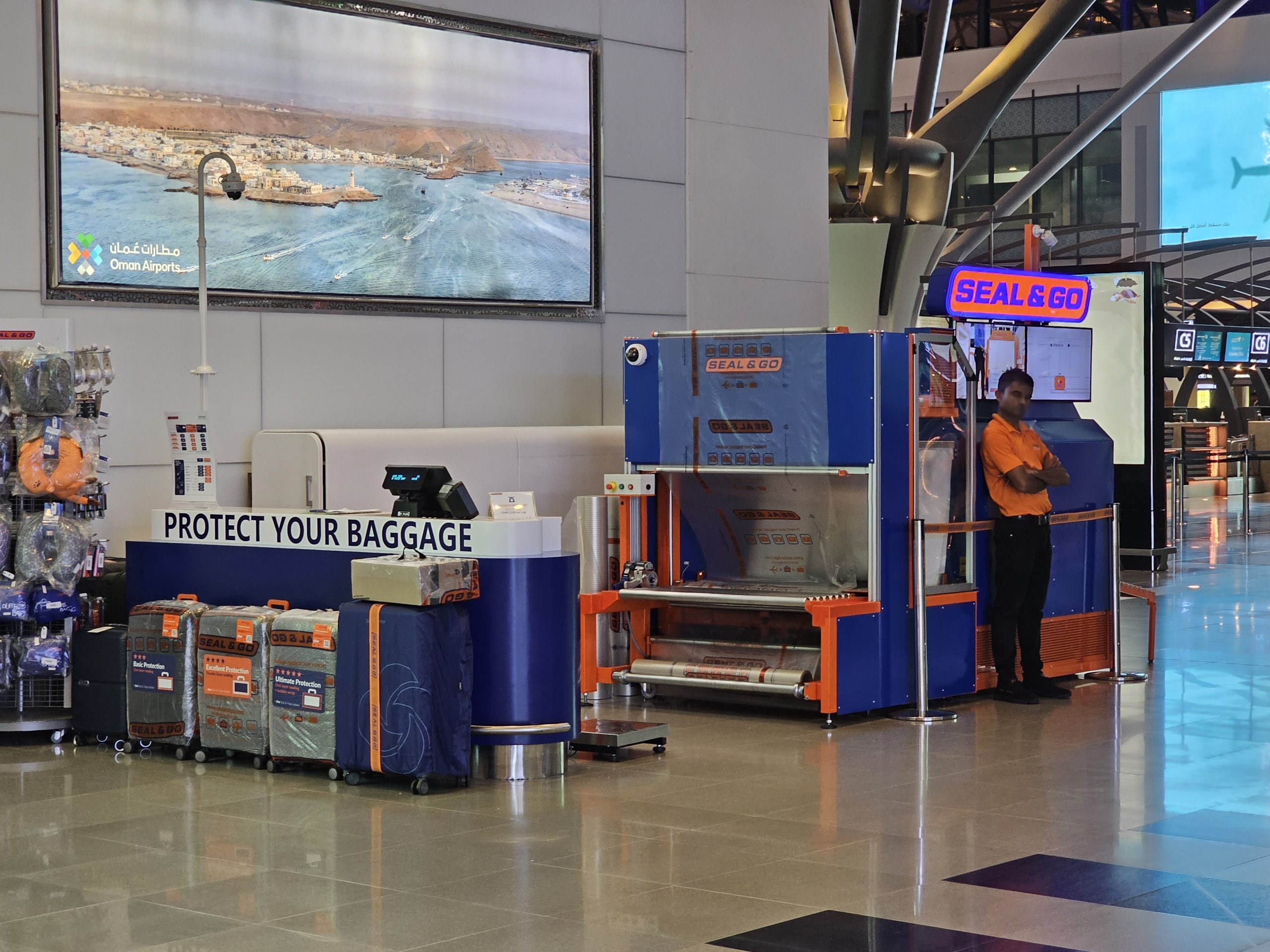 У залі вильоту є кілька кіосків, де ви можете загорнути свій багаж у захисну плівку за плату від 3 омр до 6 омр (залежно від розміру вашої валізи).