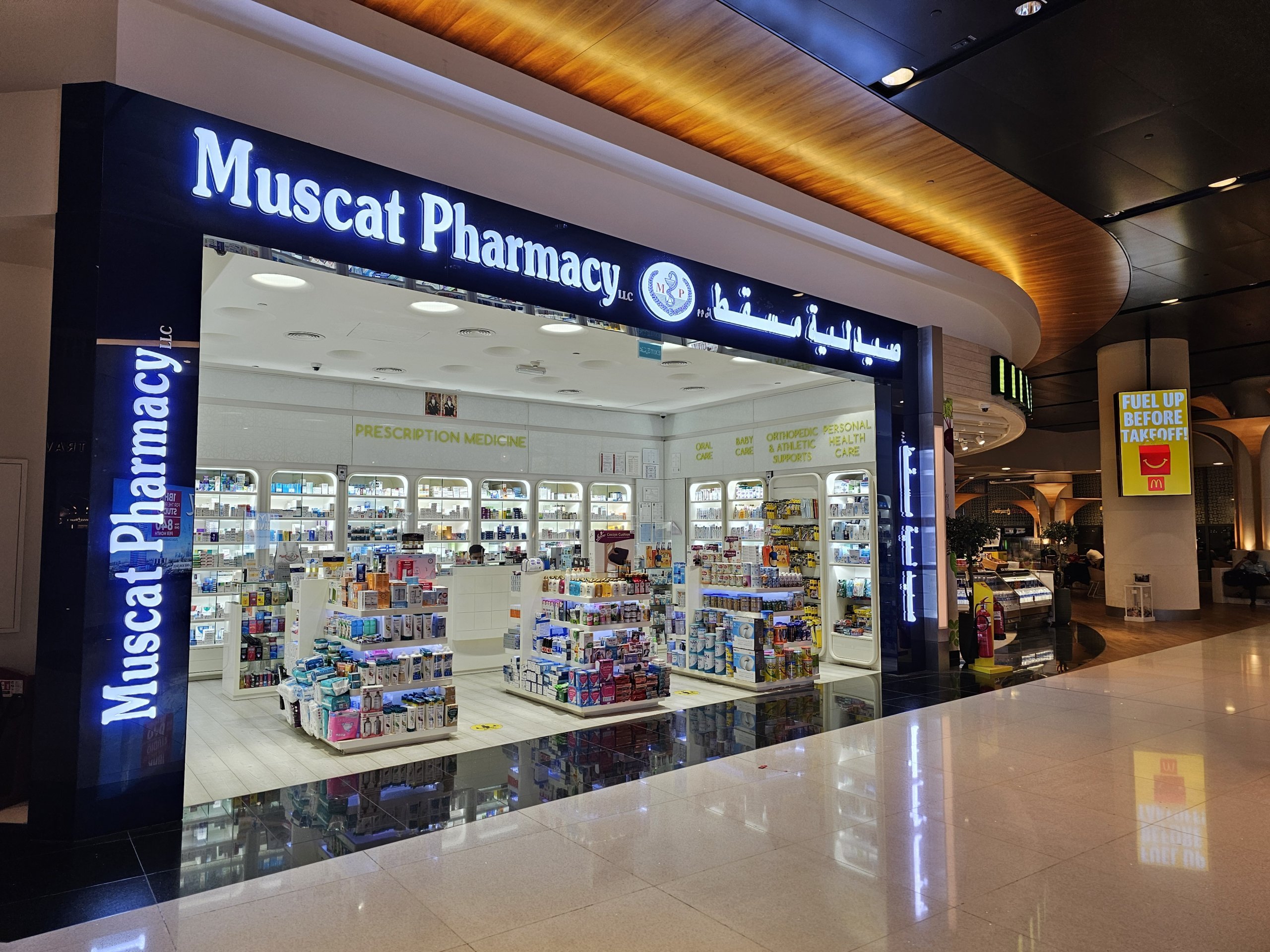 Аптеки доступні в громадській зоні (на рівні вильоту) і в транзитній зоні.
