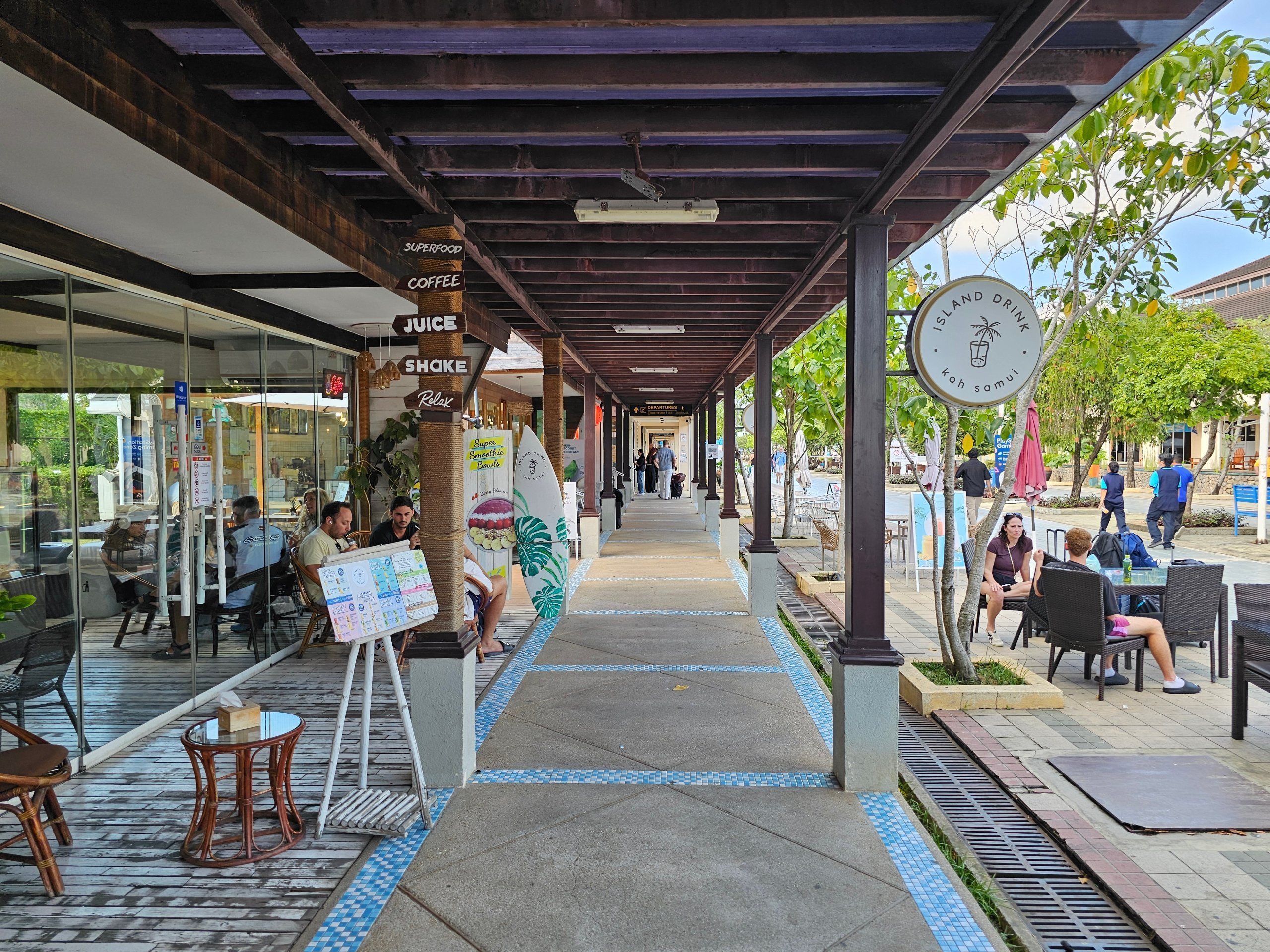 Стандартні кафе та ресторани, де можна купити їжу, в основному розташовані на відкритій вулиці між терміналами вильоту та прильоту.