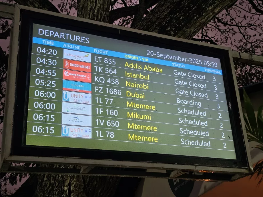 Шукаєте інформацію про прибуття або відправлення рейсів з/до аеропорту Занзібар онлайн в режимі реального часу, щоб перевірити затримку або час посадки на рейс? Офіційний сайт аеропорту завжди пропонує найточнішу інформацію: