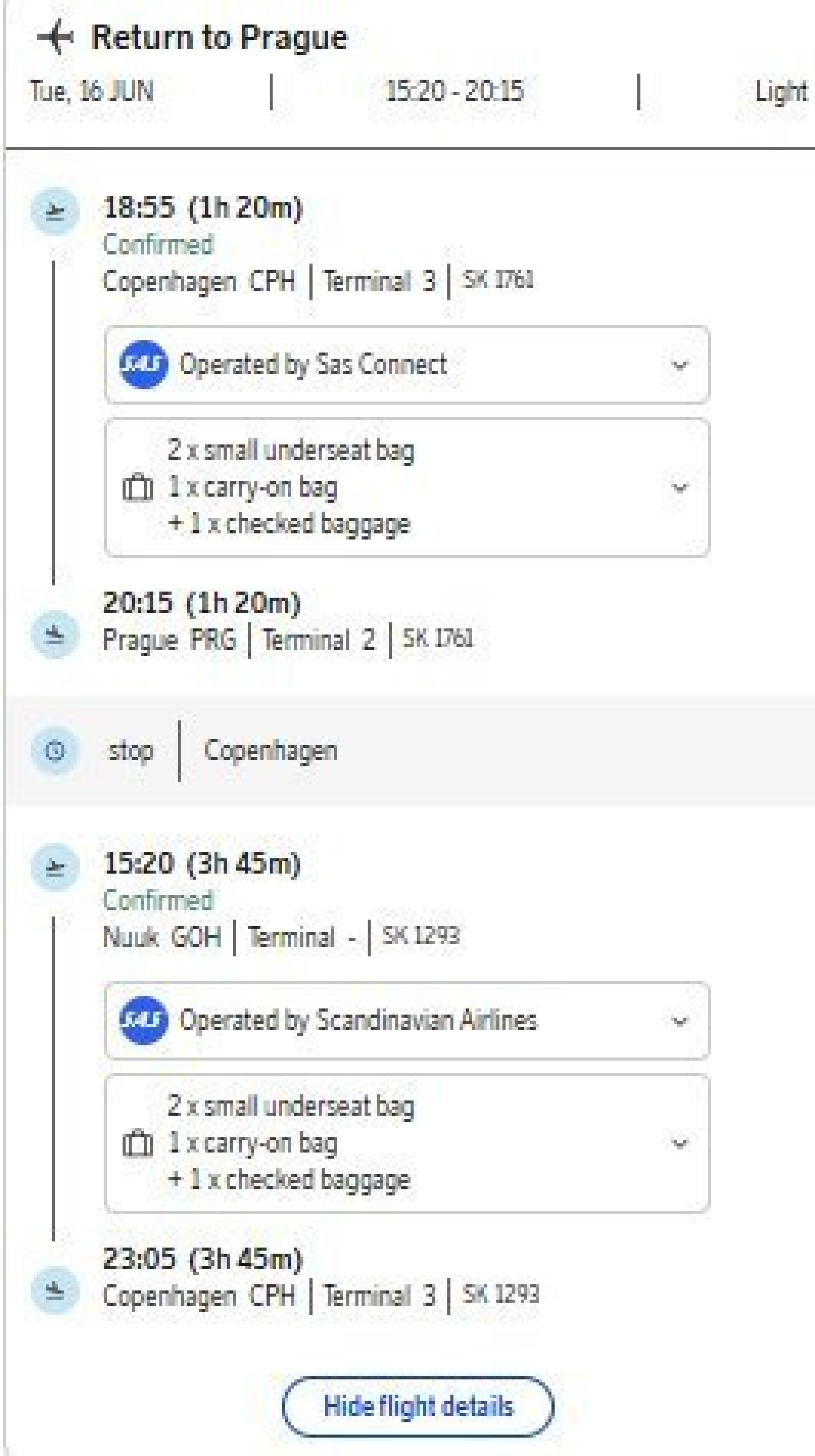 Lukas888 дякую за відповідь. Там не так багато варіантів, вони перенесли рейс Нуук - Копенгаген на один час з прибуттям в Копенгаген завжди о 23:05. Інші рейси до Праги вранці, тому це завжди нічний переліт. З Нуука у SAS є, мабуть, лише один маршрут - до Копенгагена.