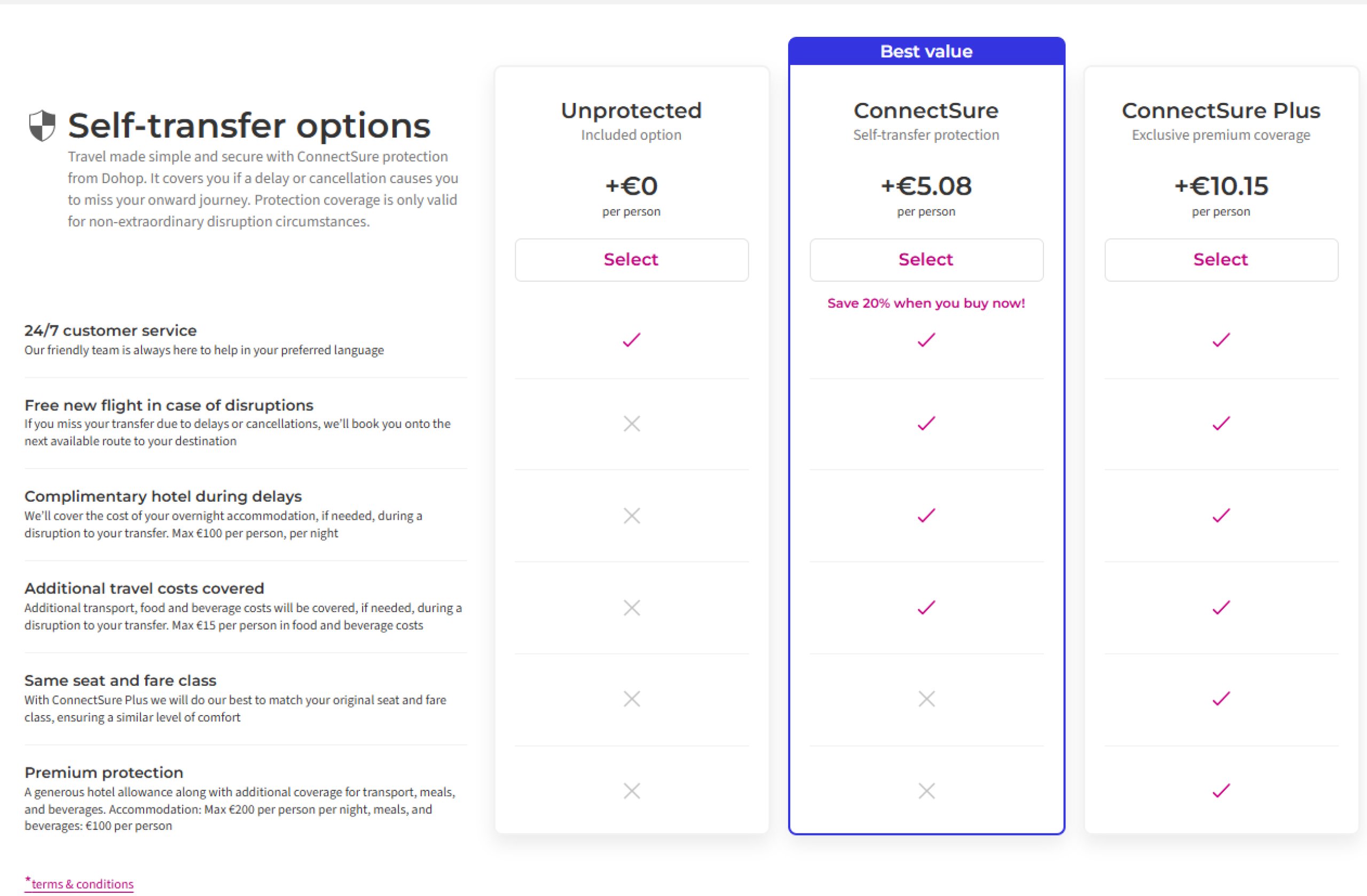 Якщо ви хочете мати гарантований стикувальний рейс, ви також повинні придбати разом із квитками послугу ConnectSure, яка обирається під час бронювання рейсу.