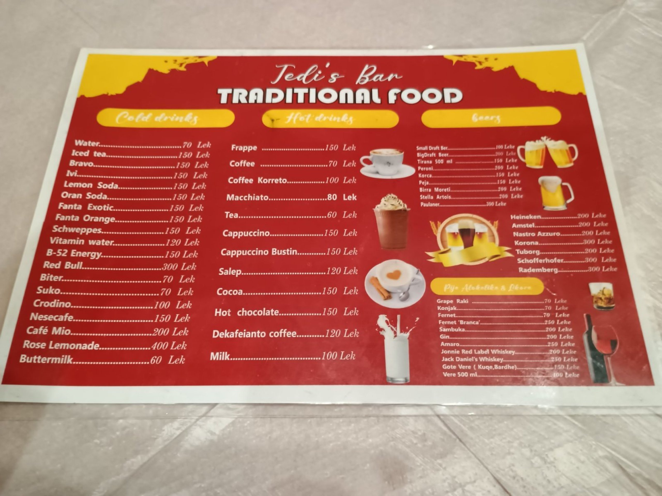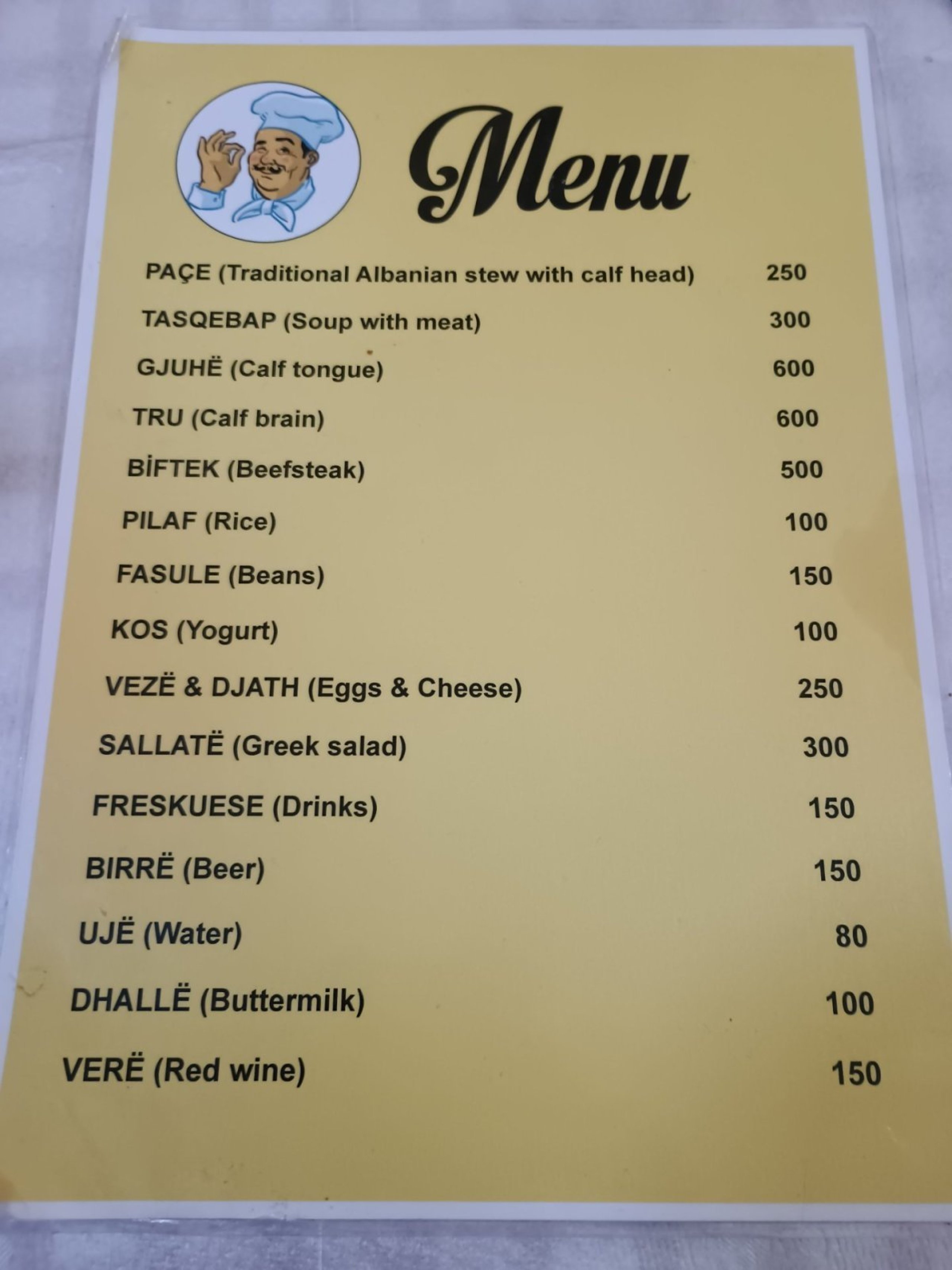 Я додаю меню зі звичайного албанського нетуристичного ресторану біля автовокзалу в Драчі та ринку в Тирані - суттєва різниця порівняно з цінами в ресторанах у туристичних місцях.