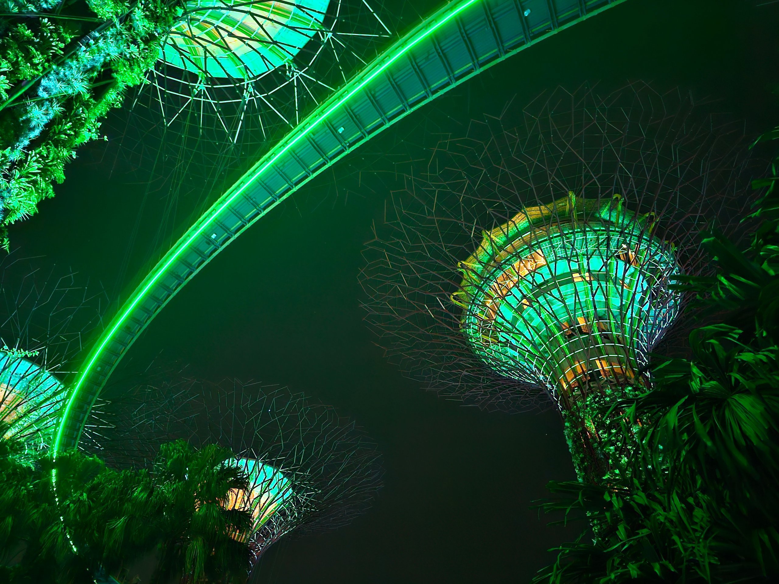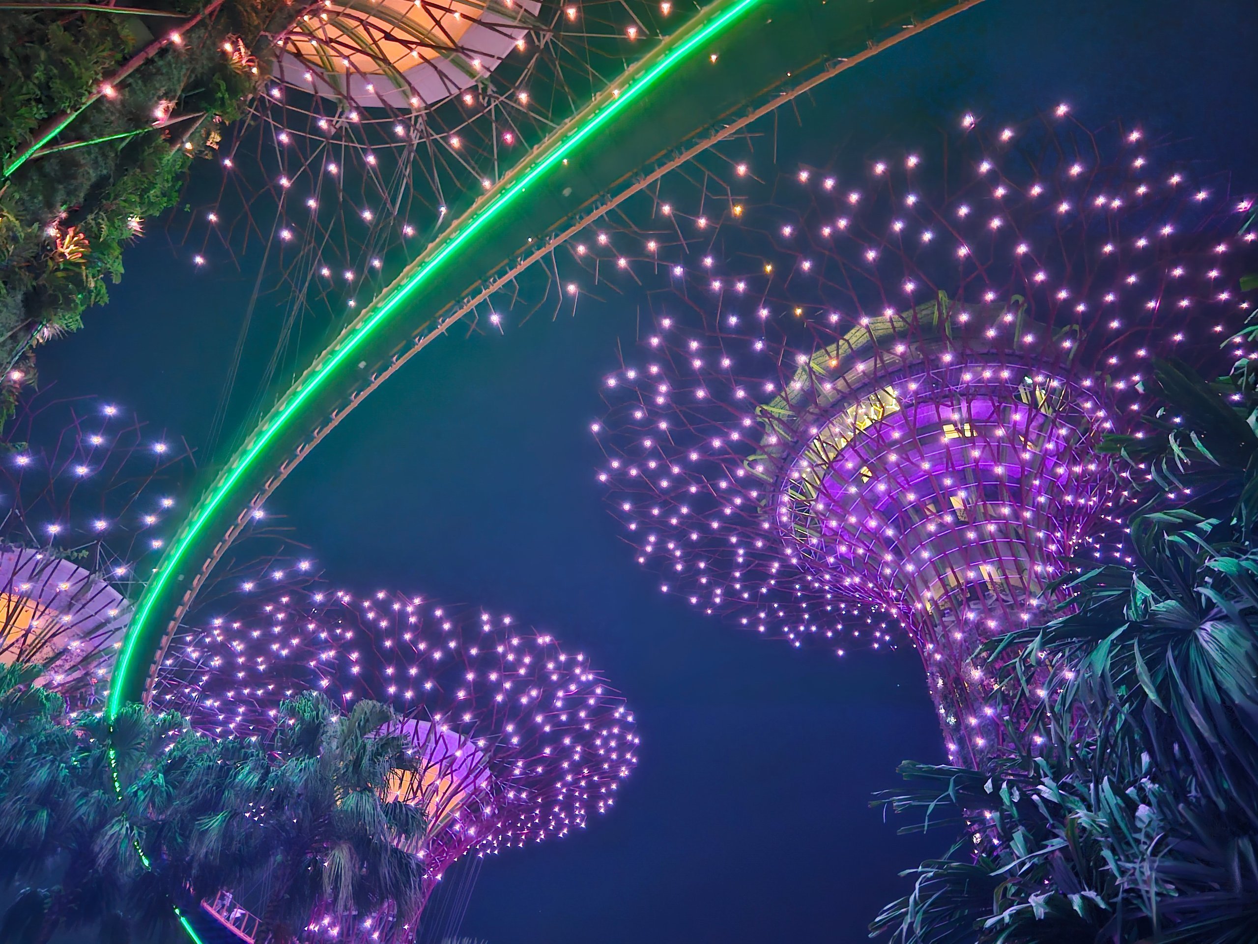 Щодня вночі в Gardens by the Bay проходить світлове шоу, яке підсвічує місцеві споруди у вигляді гігантських дерев у такт музиці. Ви будете зачаровані.