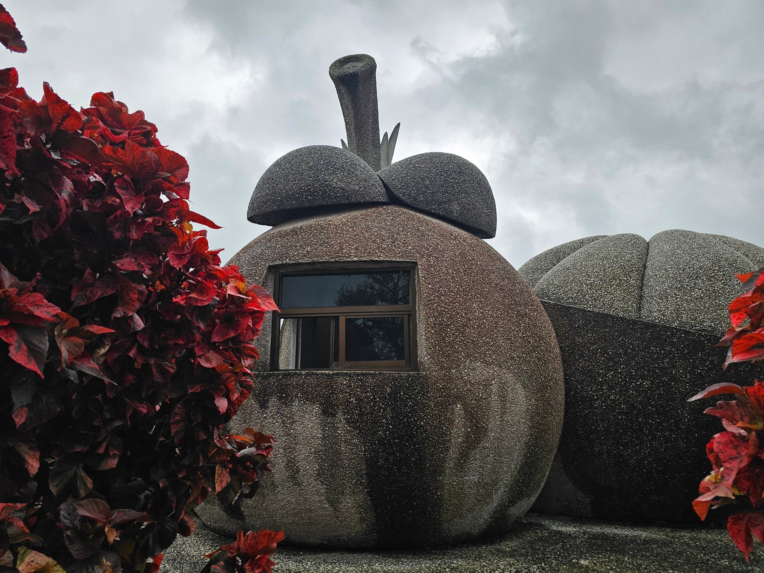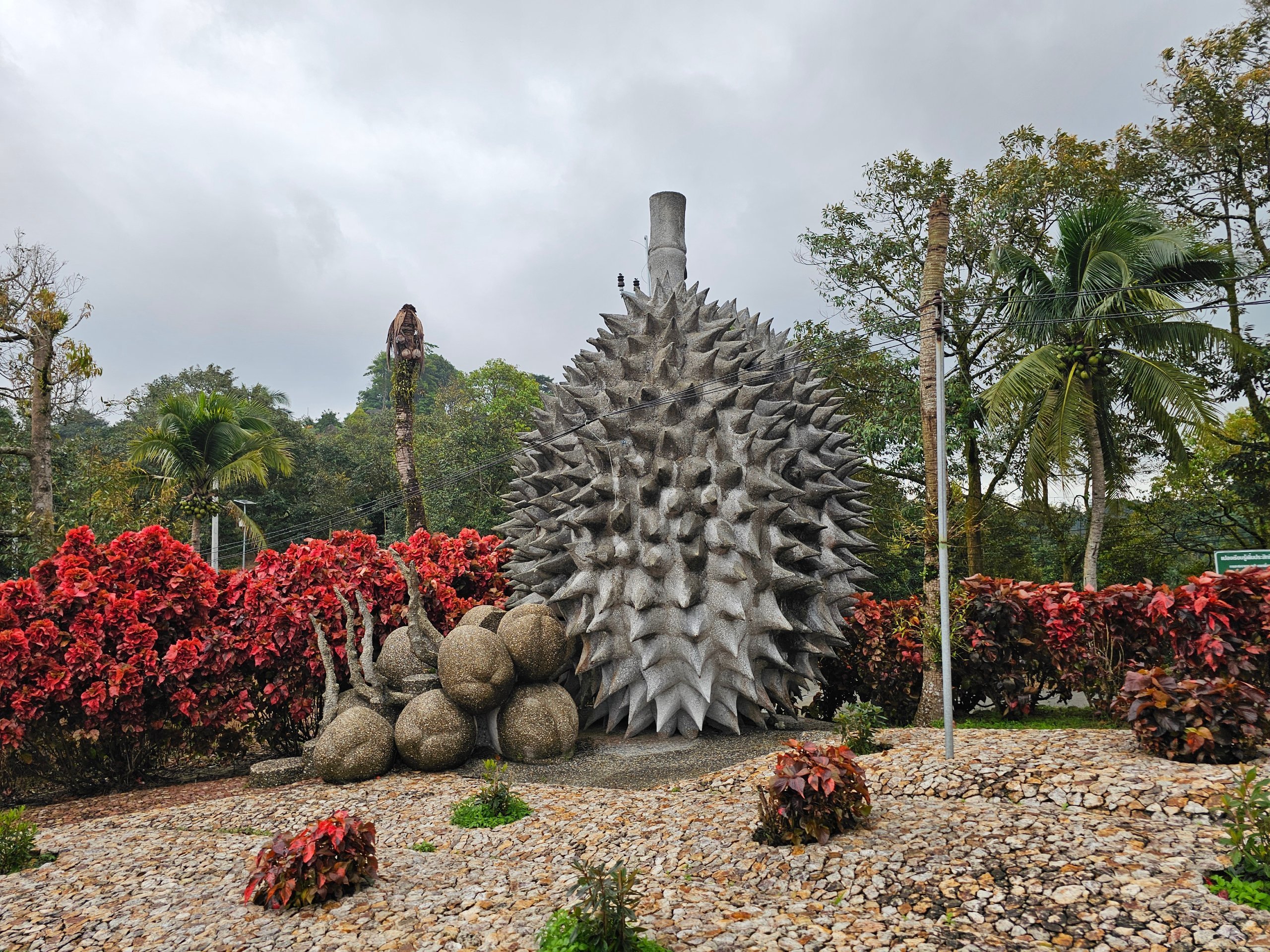 На узбіччі ви знайдете колекцію кам'яних "фруктів" (дуріан, яблуко, ананас та інші), які виглядають як химерний сад без чіткого контексту.