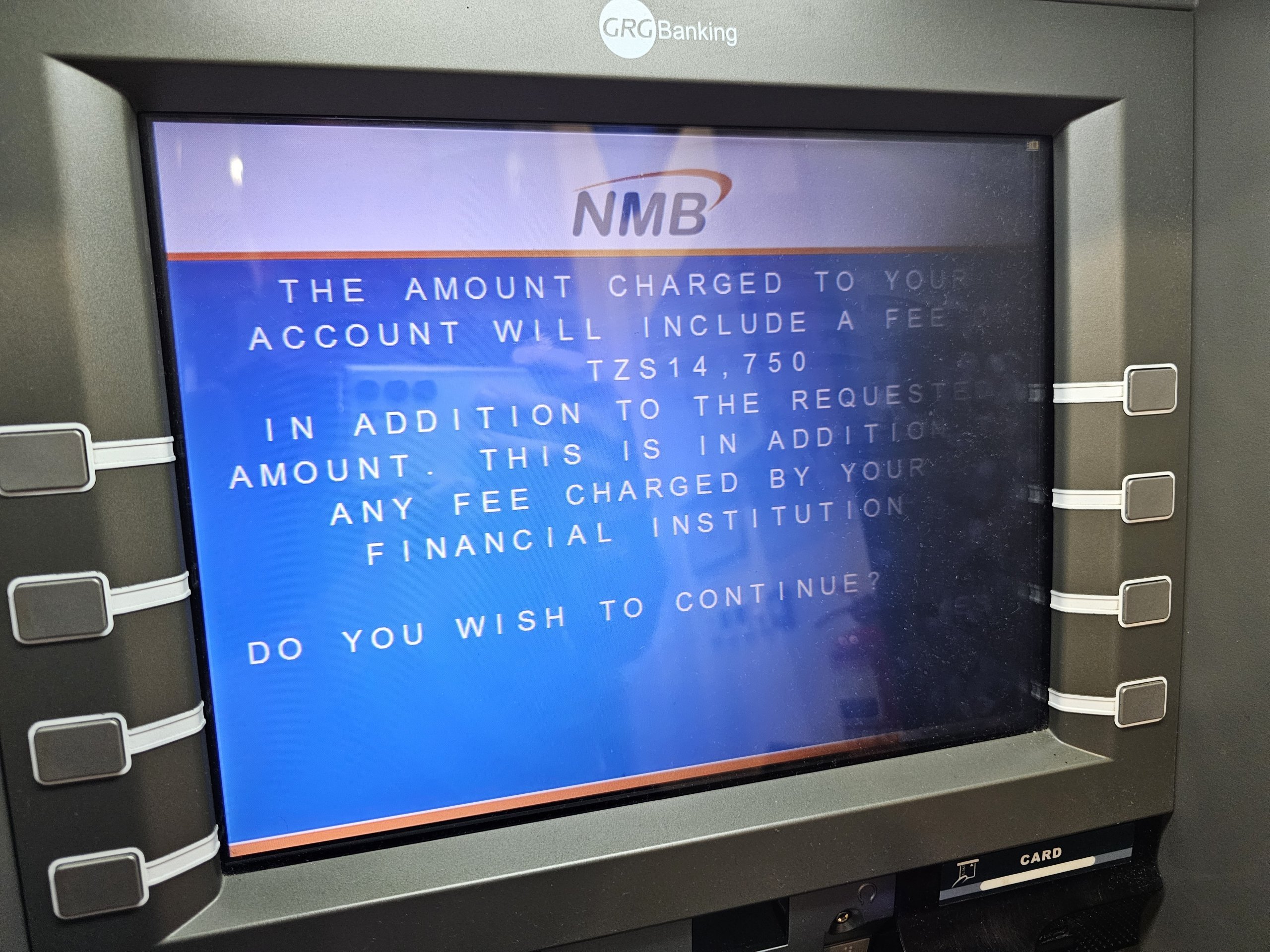 Зазвичай за зняття коштів з іноземної картки стягується комісія близько 15 000 танзанійських шилінгів. Найнижча комісія, з якою ми зіткнулися в банкоматі Bank of Zanzibar, становила 10 000 tzs.