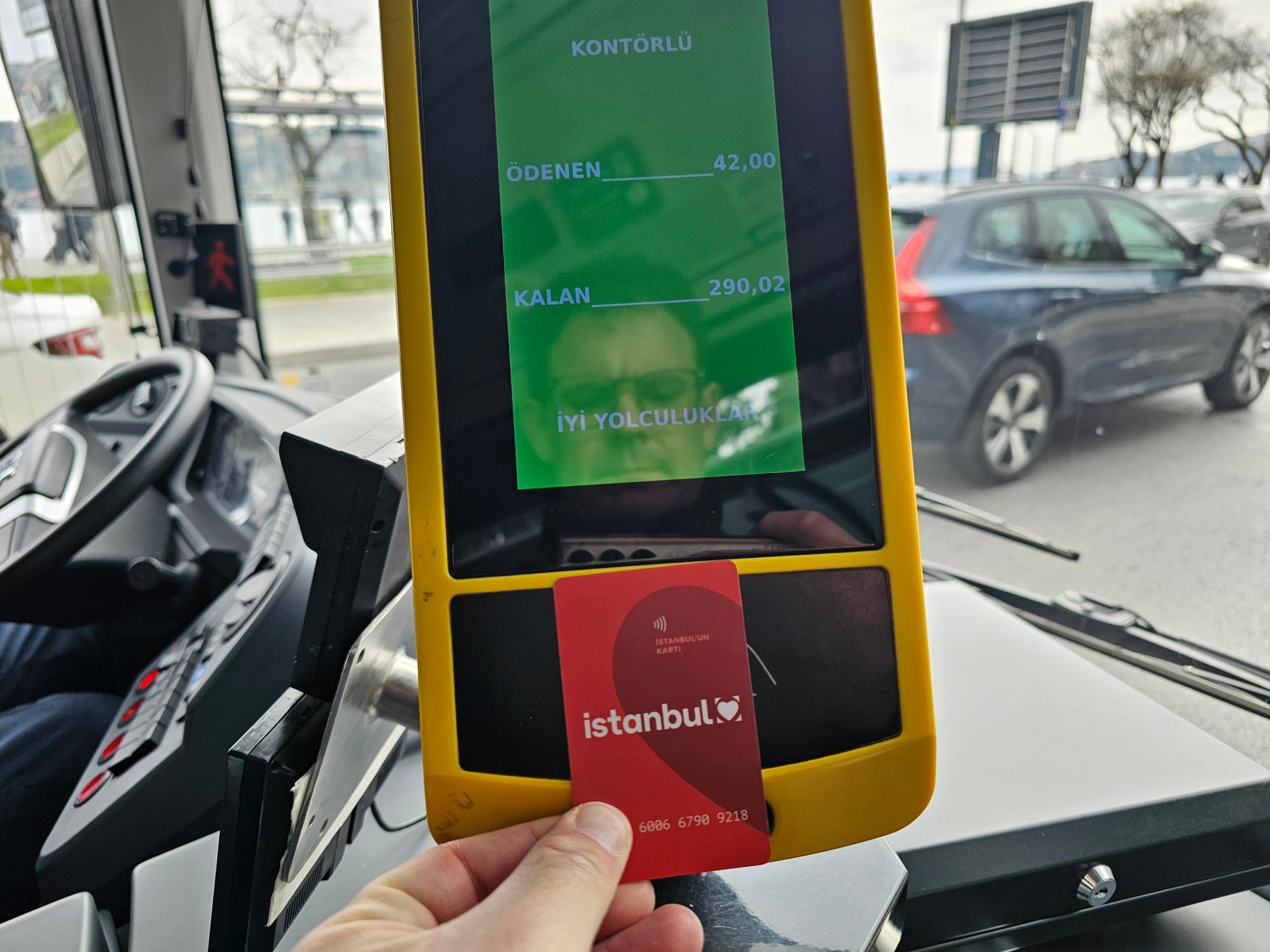Біля водія є валідатор, до якого ви прикладаєте картку Istanbulkart або власну безконтактну картку.