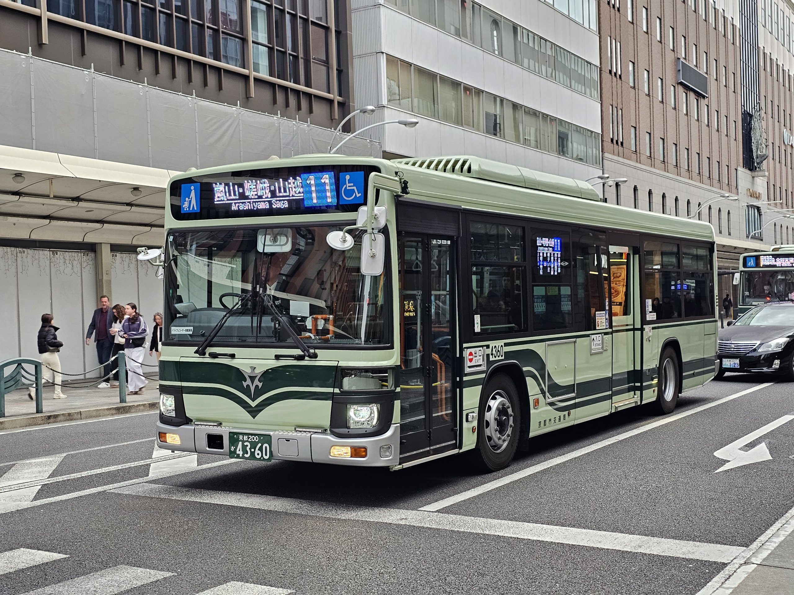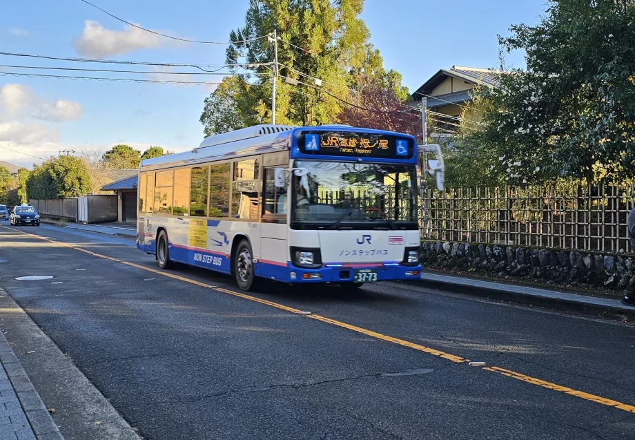 Кремові автобуси з червоною смугою курсують від вокзалу Кіото до таких районів, як Арасіяма або навпаки на північний схід до Івакури та Охари.