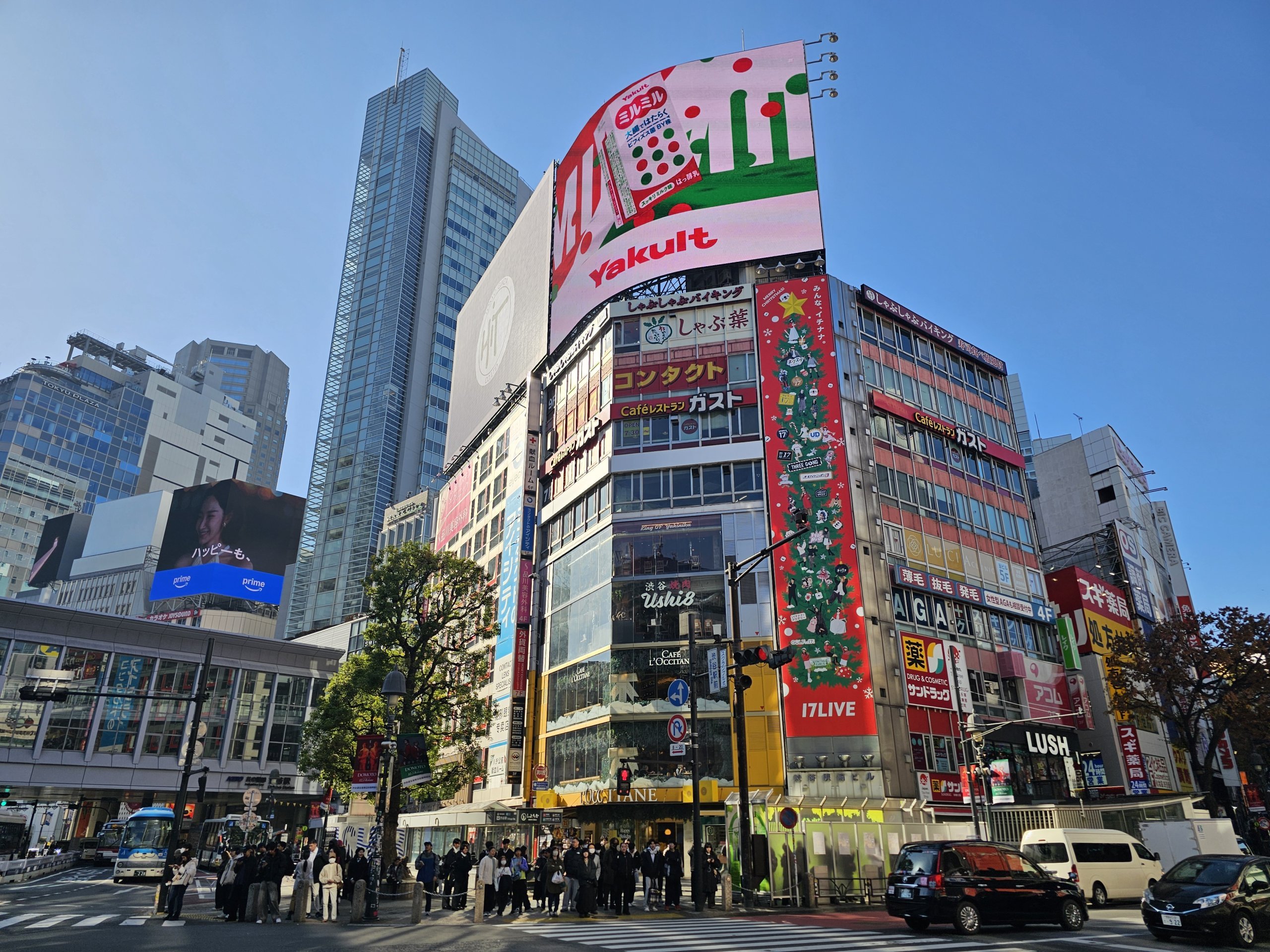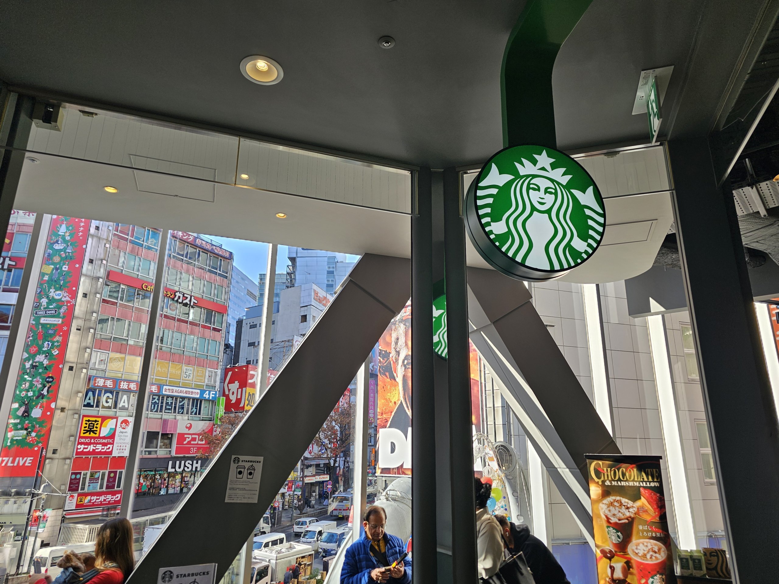 Звідси відкривається гарний вид на перехрестя Сібуя, хоча і не такий ідеальний, як з Share Lounge, оскільки його трохи заважає конструкція даху.