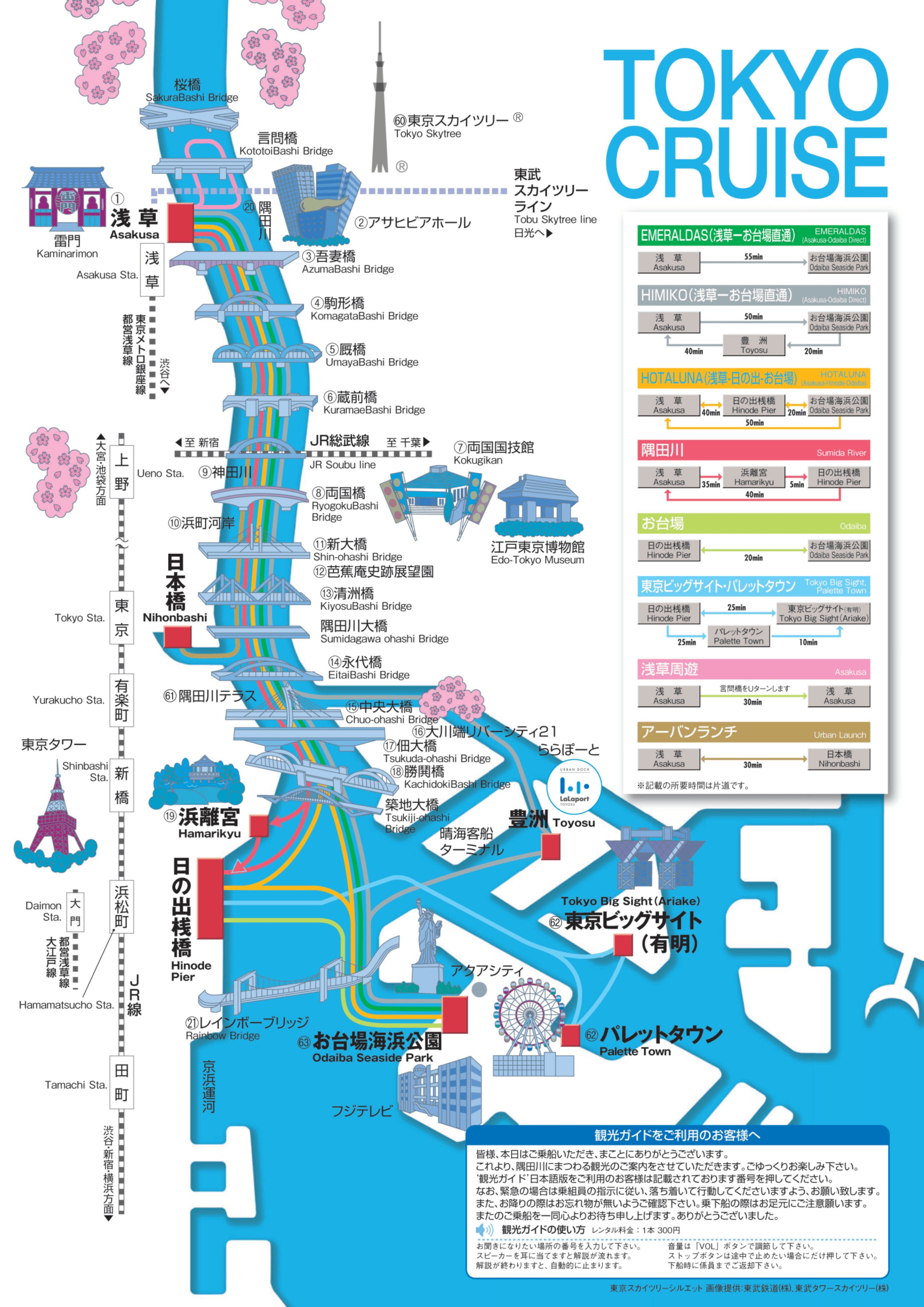 Пороми ходять приблизно 8-9 разів на день, а вся подорож від Асакуси до статуї Свободи в Одайбі займає близько 45 хвилин.