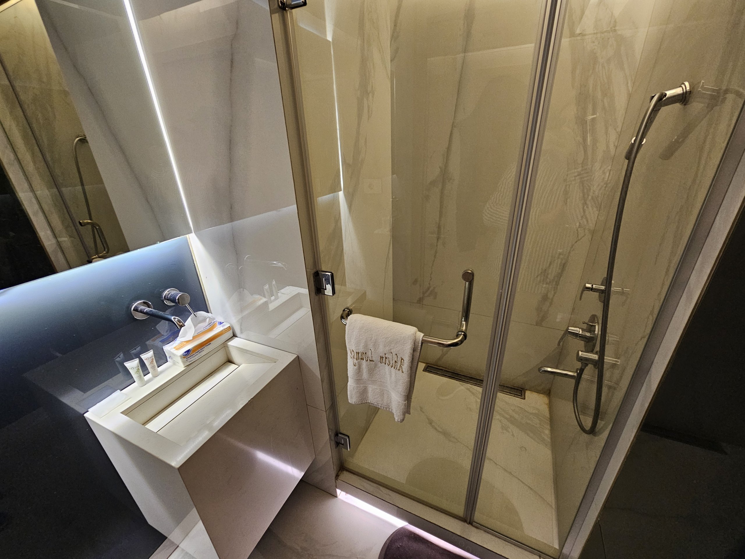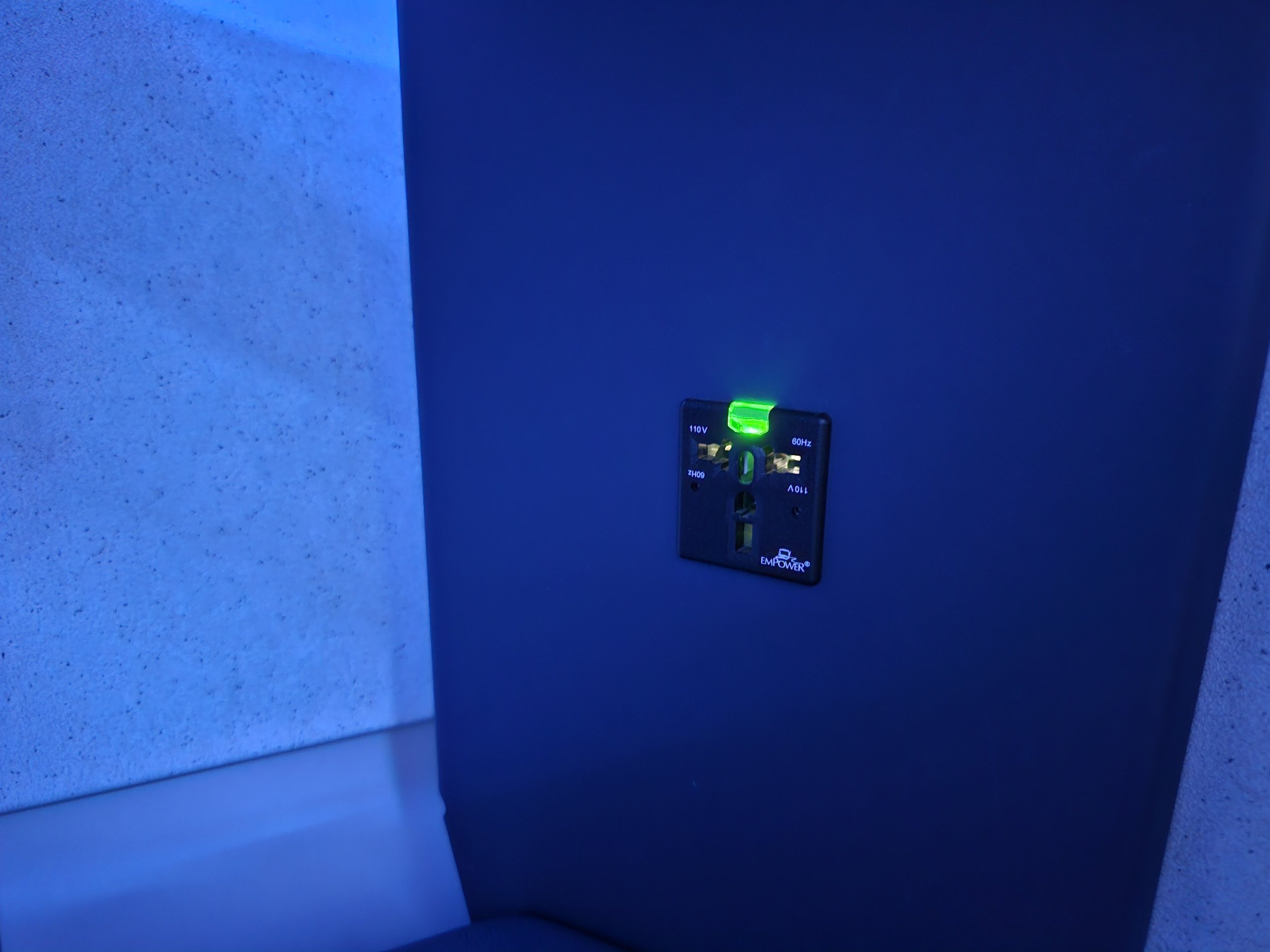 Елегантну атмосферу підкреслює синє нічне освітлення, адже наш рейс відправляється о 4:35 ранку.