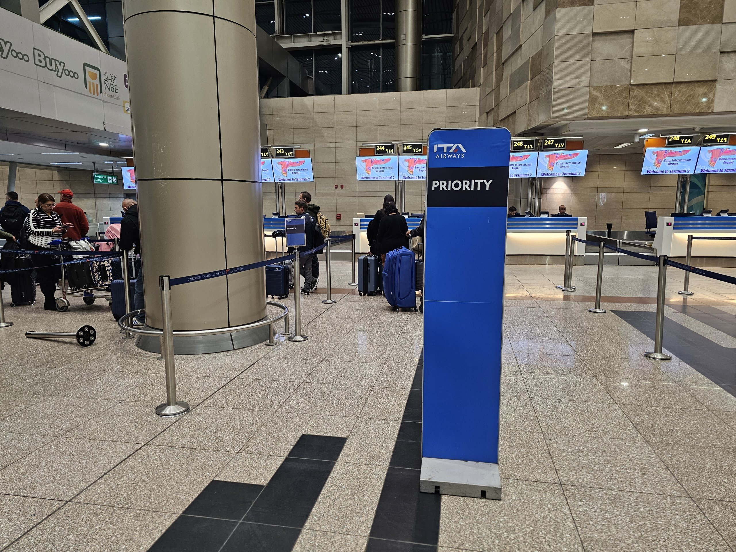 Я реєструюсь в аеропорту Каїра, де авіакомпанія ITA Airways має 5 спеціальних стійок реєстрації в терміналі 2.