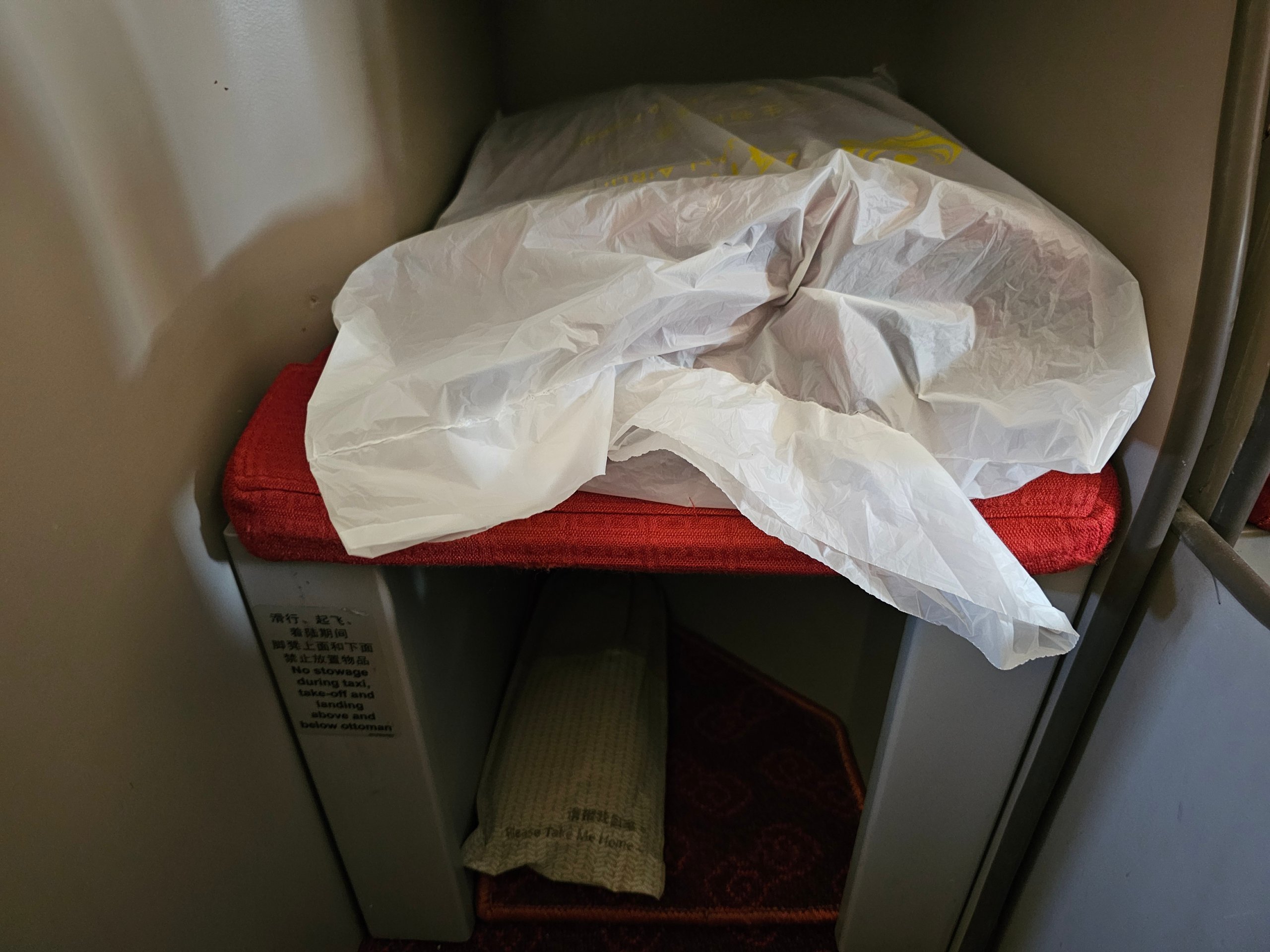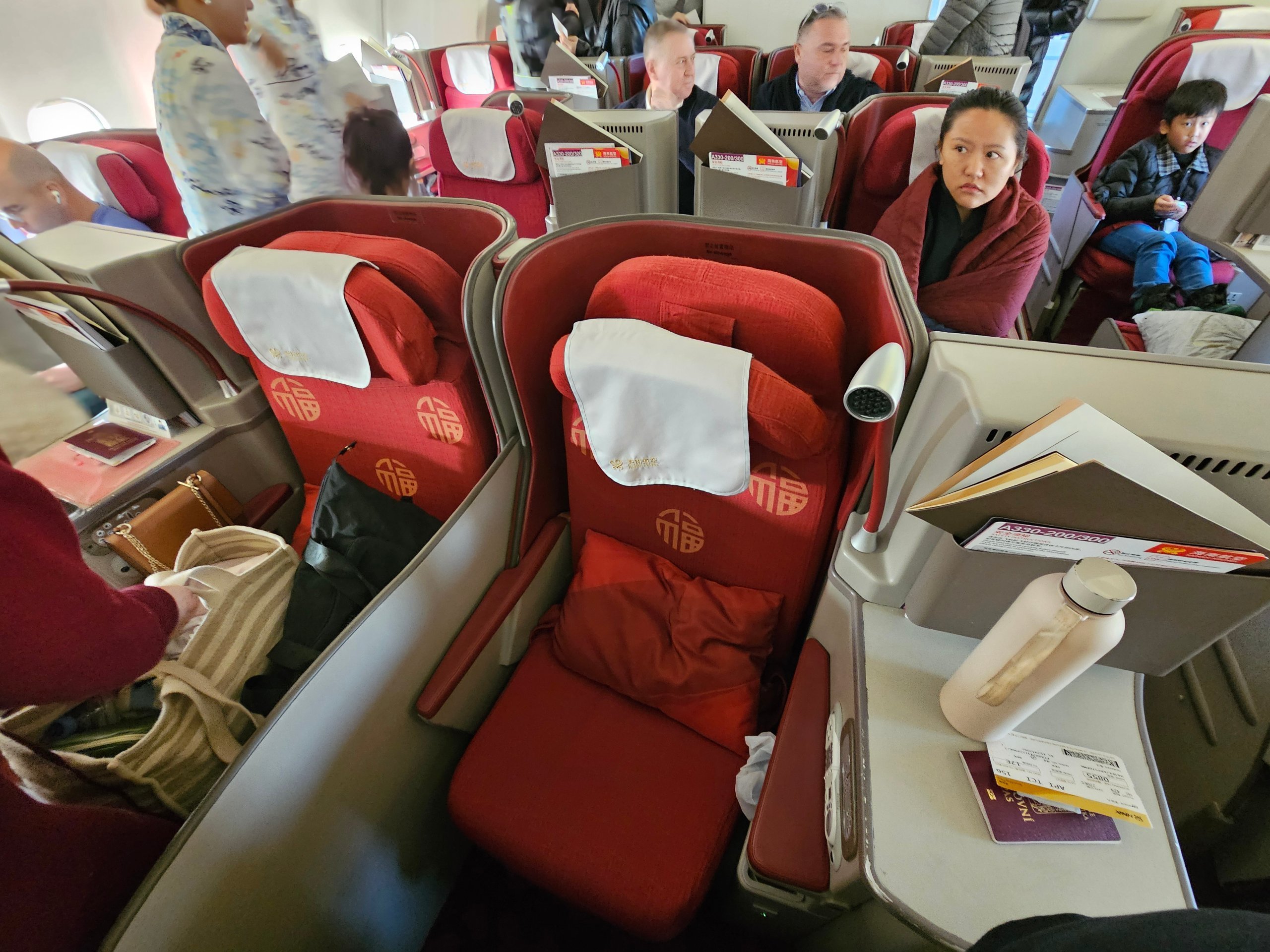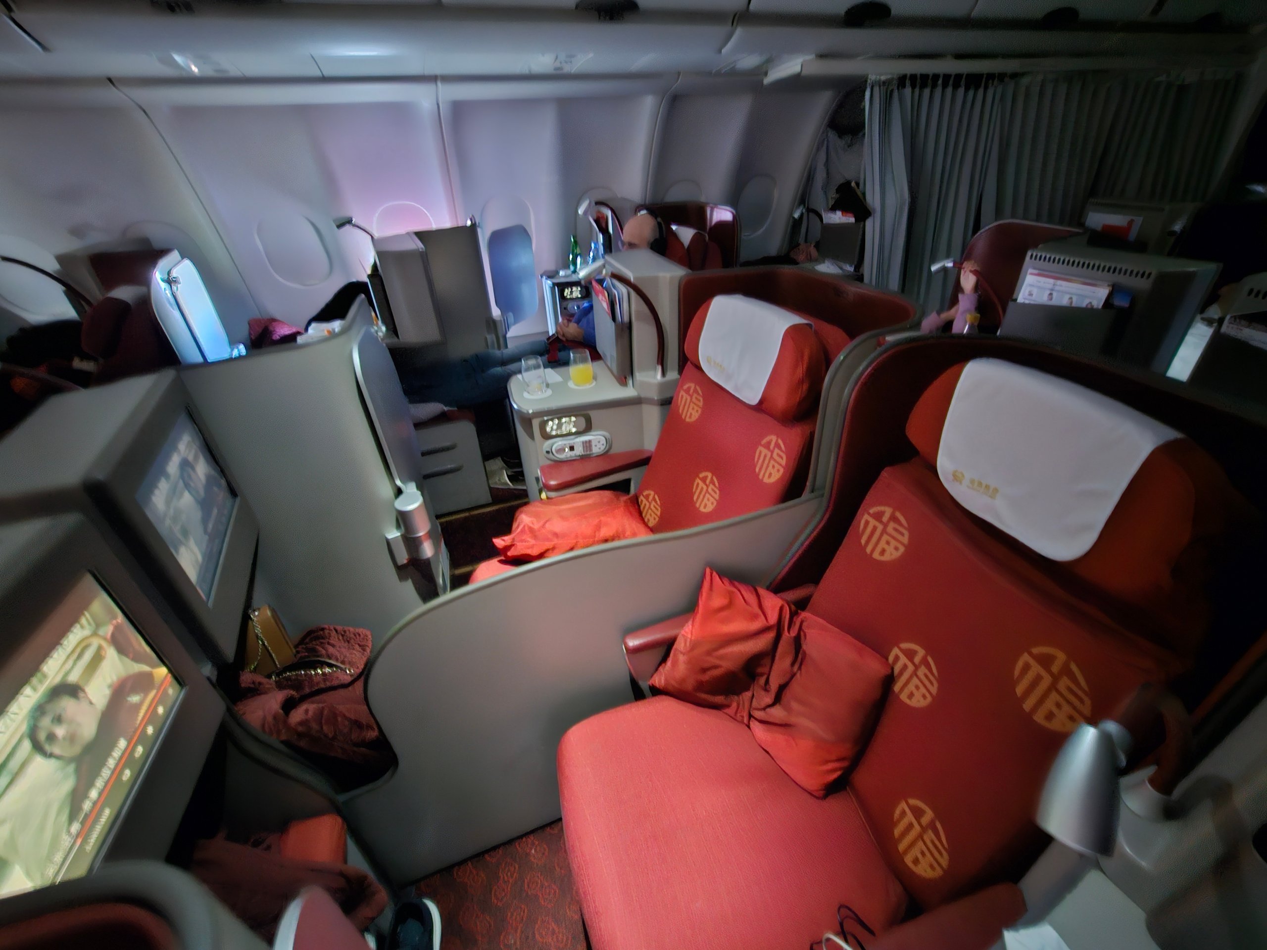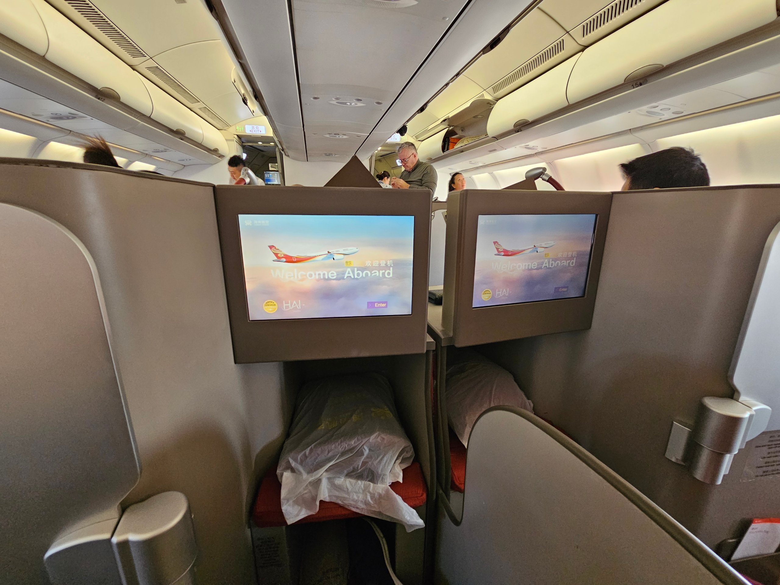 Літак Airbus A330-300 авіакомпанії Hainan Airlines у конфігурації Stelia Solstys пропонує повністю пласке ліжко та суцільний комфорт. Однак, порівняно з першим сегментом з Праги, приватність тут нижча, а загальне відчуття менш преміальне.