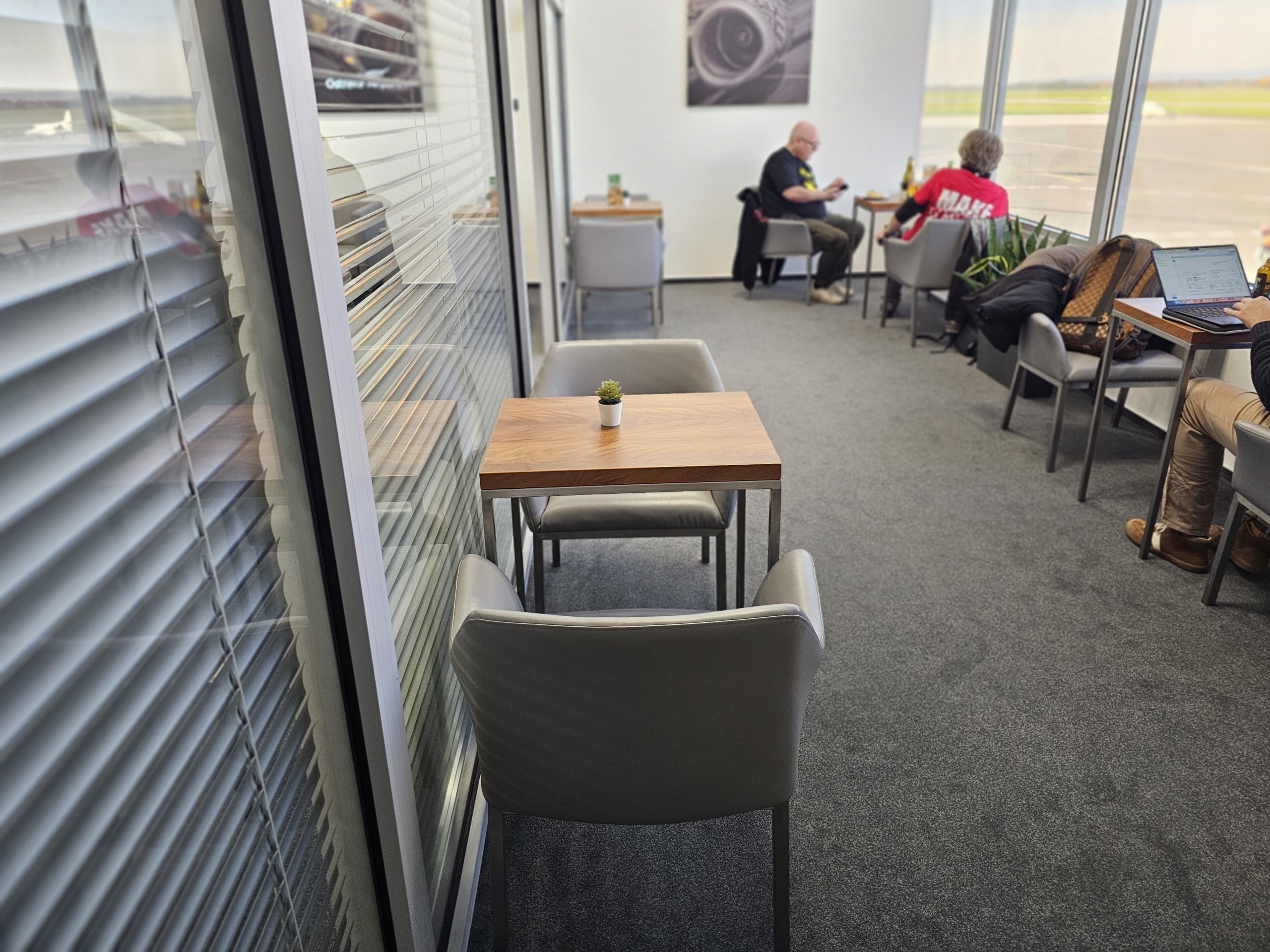 Найпопулярніша секція знаходиться зліва, де ви знайдете 4 обідні столики з видом на злітно-посадкову смугу.