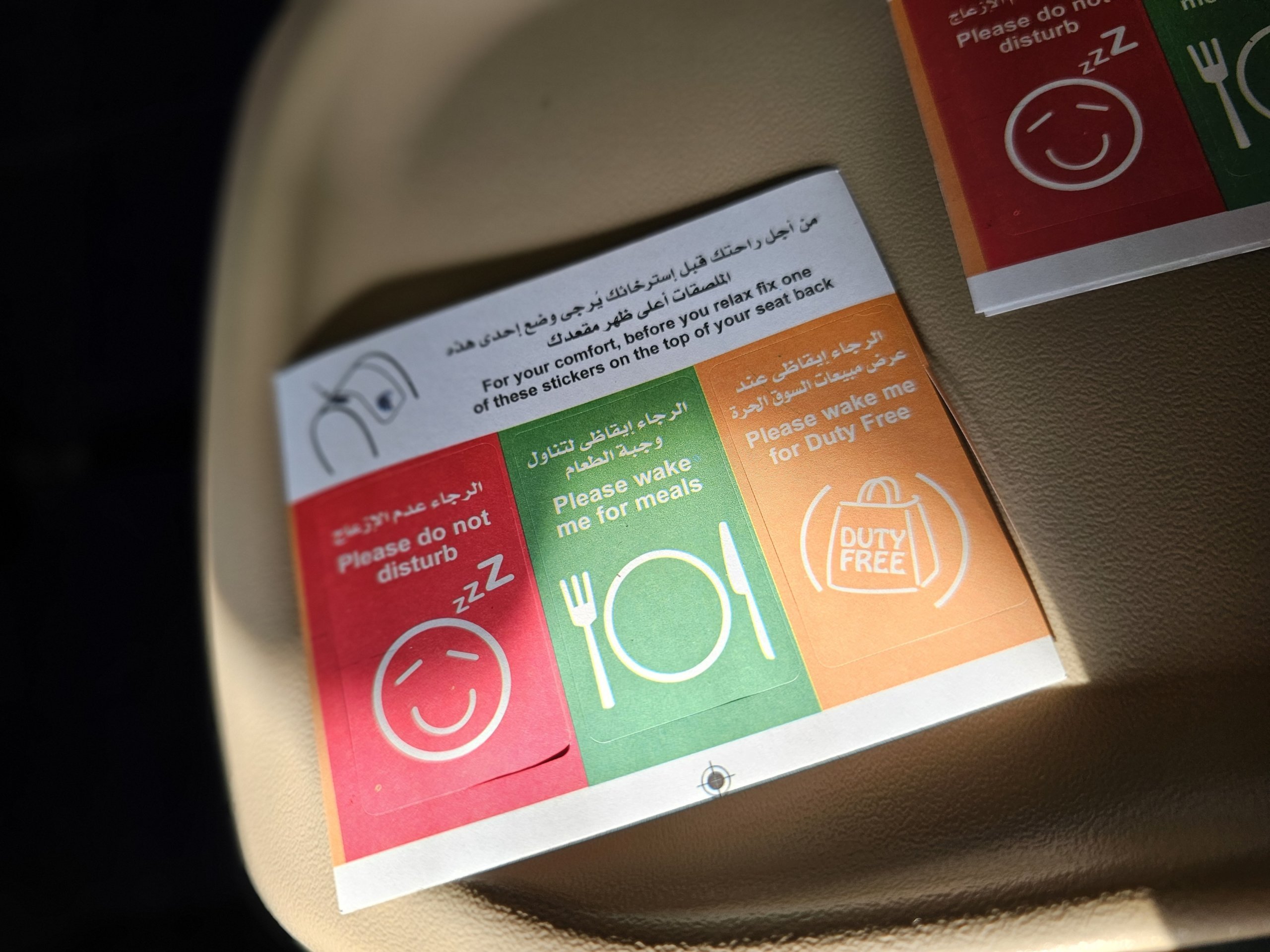 Приємна деталь - наклейки з інформацією для екіпажу, чи хочете ви, щоб вас розбудили для прийому їжі, чи, навпаки, не хочете, щоб вас турбували під час польоту. Ви наклеюєте обрану вами наліпку на верхню частину свого сидіння.