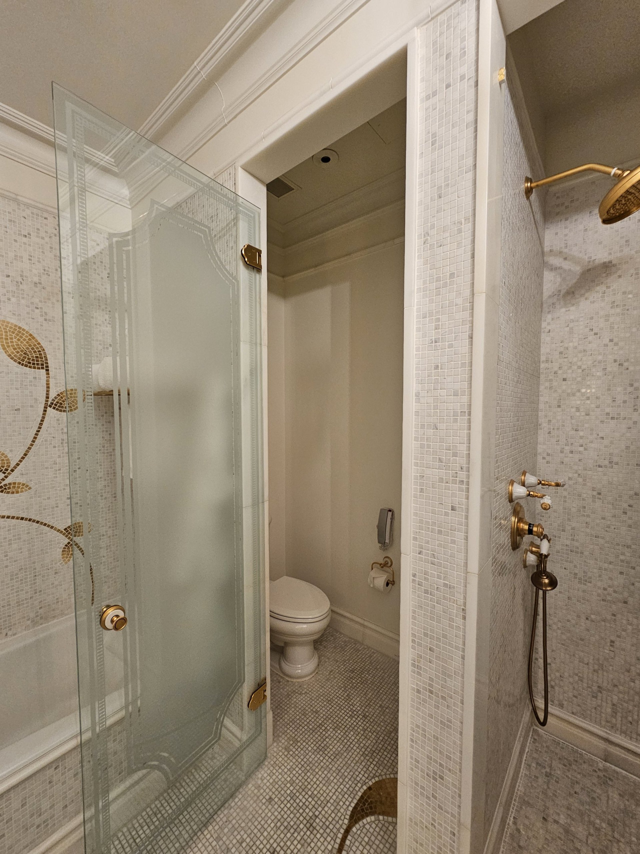 Я оцінив красиву і дуже простору ванну кімнату з ванною, раковиною і двома окремими кімнатами для туалету і душу.