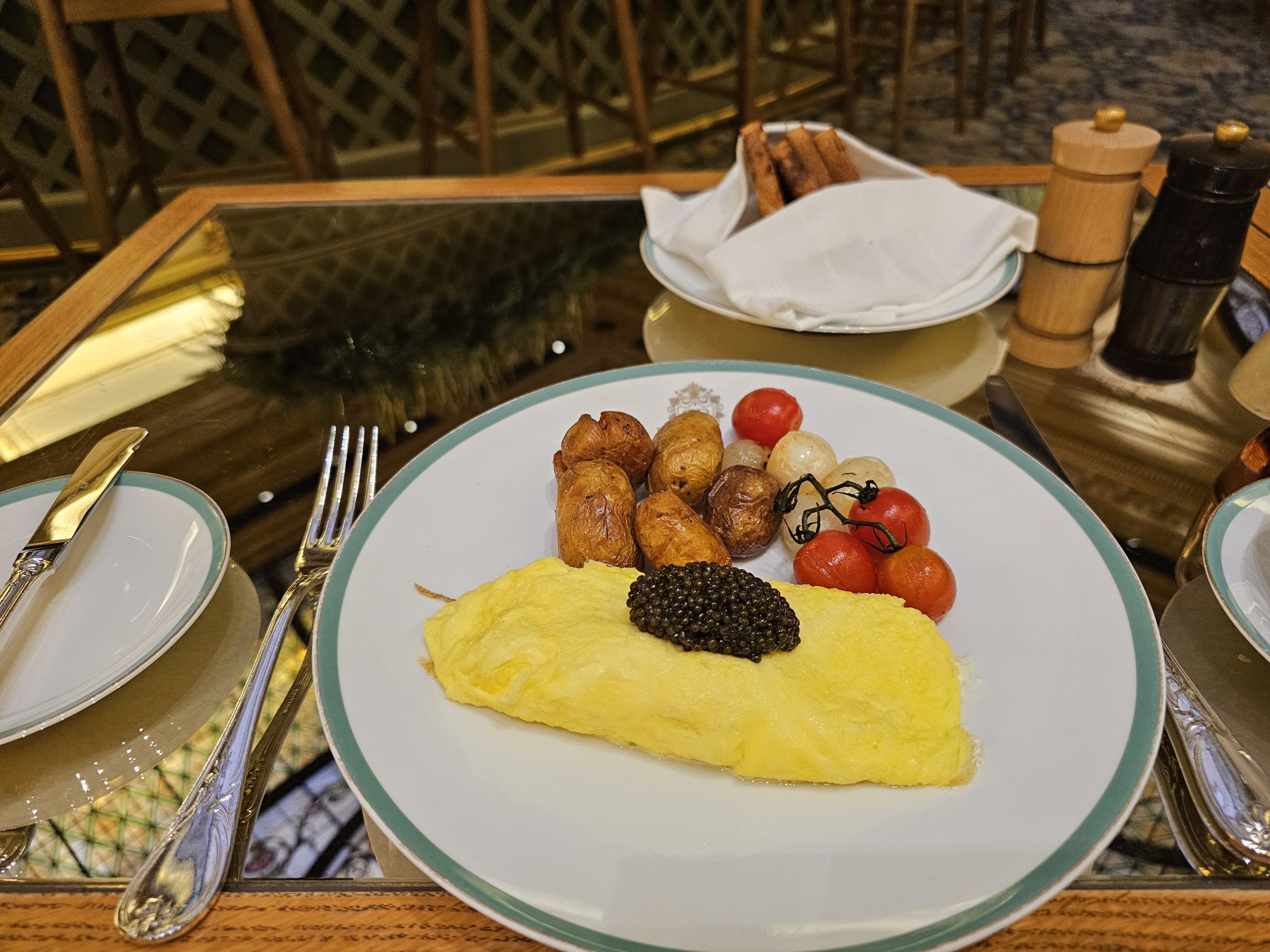 Сніданок подається як у Пальмовому дворику, так і в Шампанському барі - ви можете замовити однакову їжу в обох місцях.