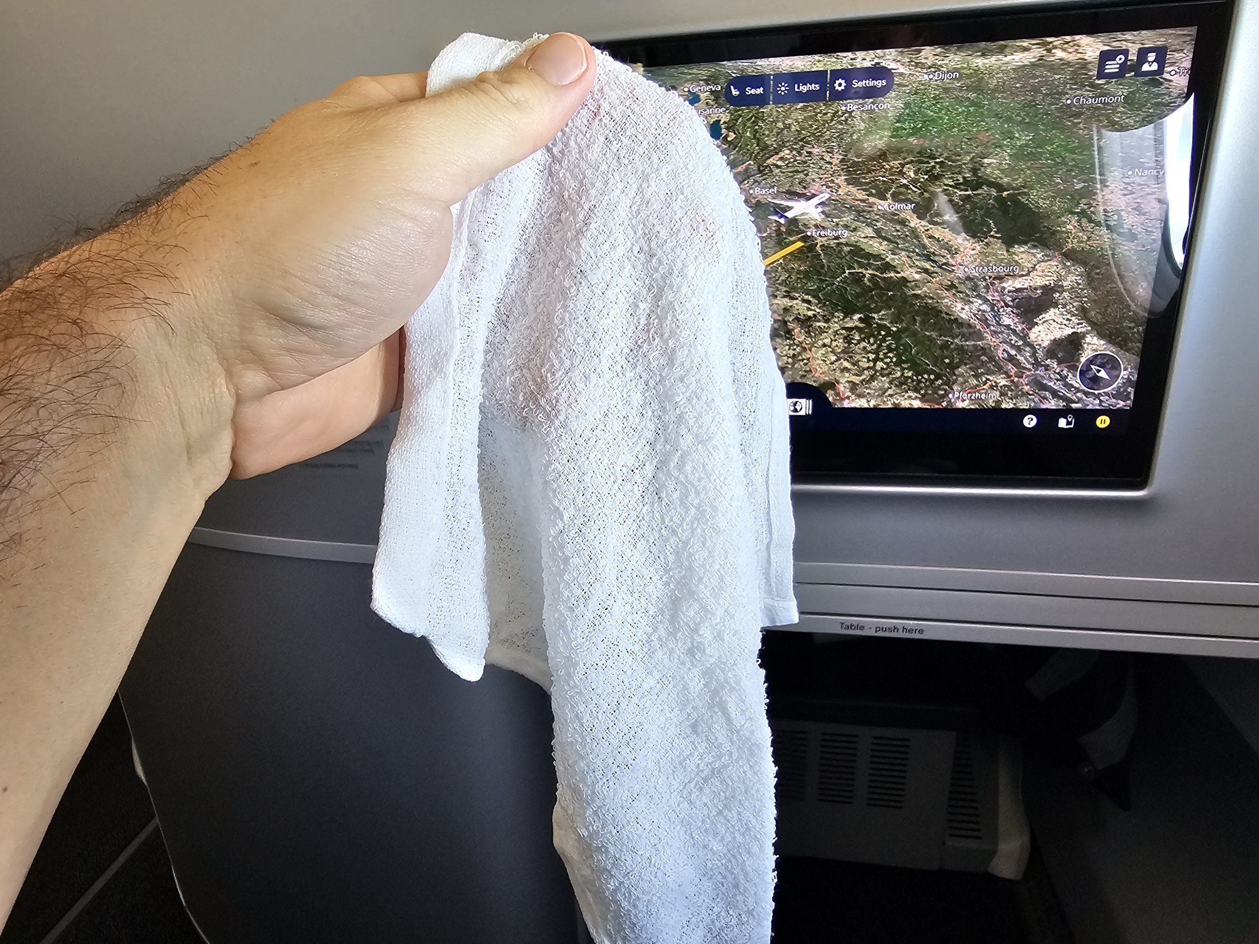 Основну страву приносять приблизно через годину після зльоту. Перед їжею ми отримуємо традиційну гарячу вологу серветку, яку роздають ще раз перед посадкою.